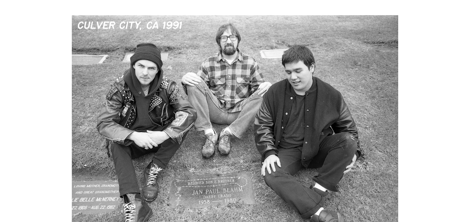 On our way to deliver the master plates of "Plea For Peace" to the pressing plant, we decided to stop at Holy Cross Cemetery in Culver City to pay our respects to Darby. (L to R) Tim "Lint" Armstrong, Murray, Eric Yee. Photo taken by Kevin Dill using Murray's camera!